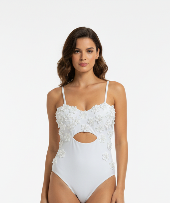 L’Art de l’Amour es una colección resortwear de trajes de baño inspirada en la abundancia floral presente en los delicados labrados de la arquitectura barroca. Cada pieza traduce la riqueza de los relieves ornamentales en bordados sutiles y texturas cuidadosamente construidas sobre un lienzo de blancos puros, evocando pureza, romanticismo y sofisticación.